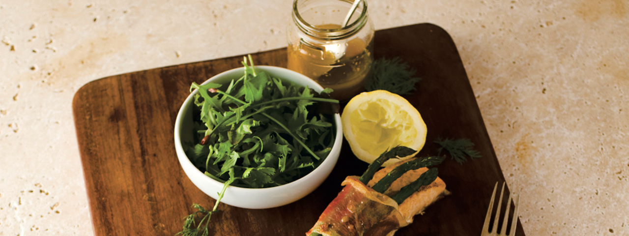 5 Enrolla ligeramente cada filete con una loncha de jamón para que no se muevan los espárragos. Aliña con la vinagreta y el zumo de limón.
